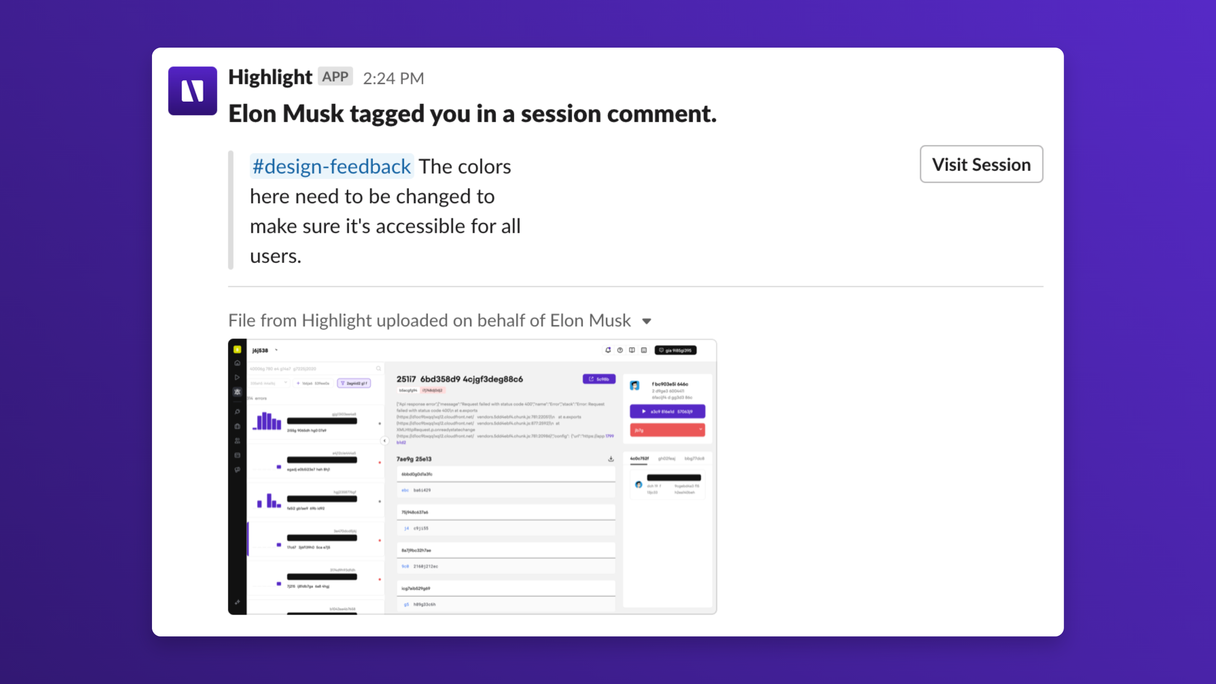 The first version of notifications we shipped only showed the comment's author and text. This wasn't ideal because since the comment is related to the video's coordinates and time, any context in the comment text is lost. By adding a screenshot, we bring the whole context of the comment to the notification. Now the recipient doesn't have to go into Highlight to get the full context, they'll have all of it with the notification.