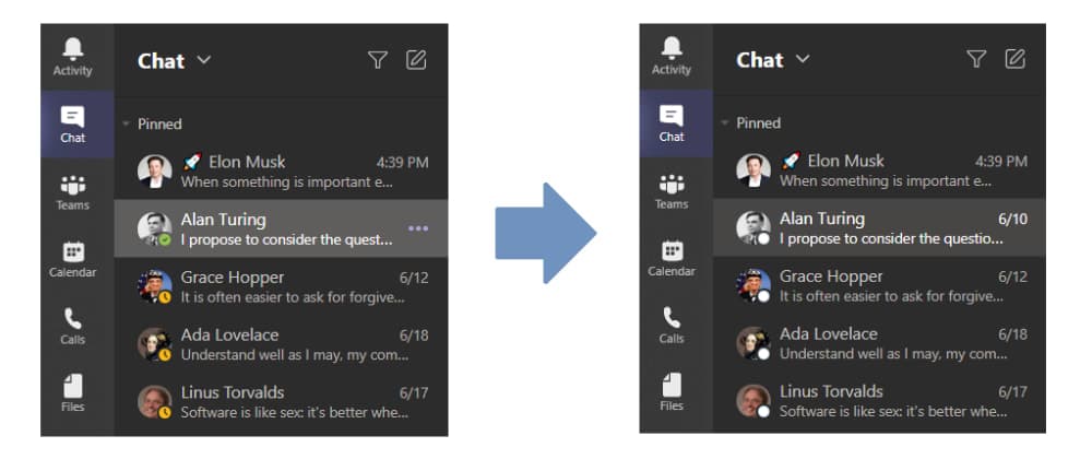 Microsoft Teams shows your coworkers current status from available, busy, to away. I can see the utility in knowing this but for myself, I'd rather not know.